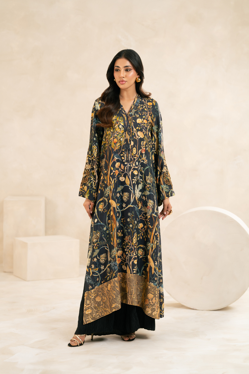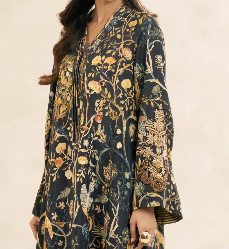 An absolute show stopper! Flowy long kurta set in a black print with auntumn hues inspired by the Tree of Life . The tunic is adoorned with warm gold lines across the hem and finished with olive and gold accents .The featuring statement is the hand worked motif on the sleeves in dull gold and bronze. It pairs beautifully with wide-leg crushed trousers for a refined yet effortless look.