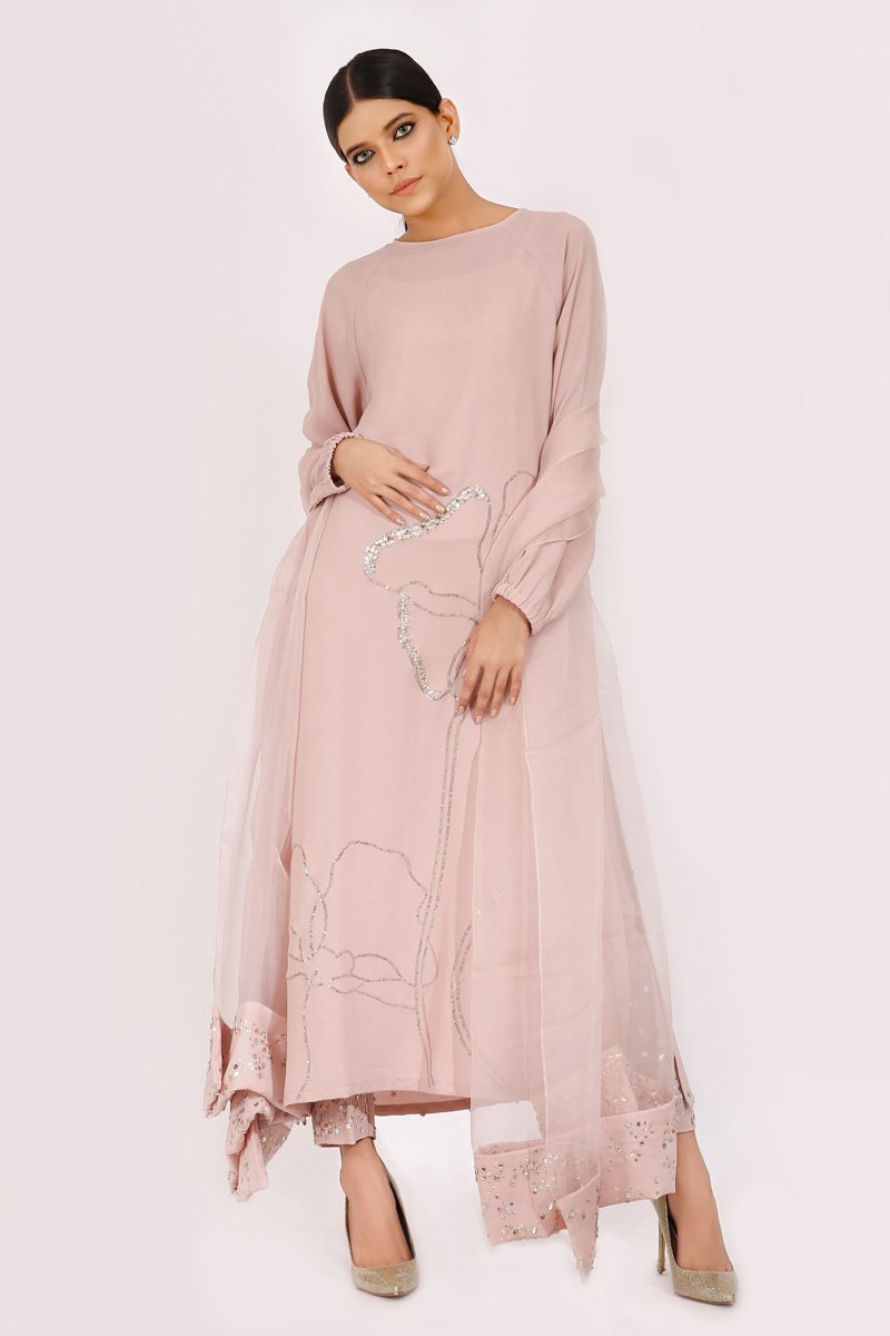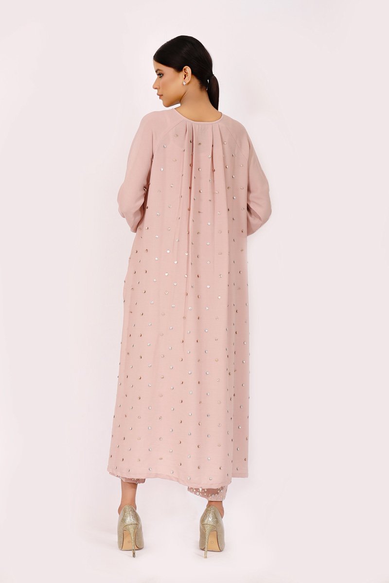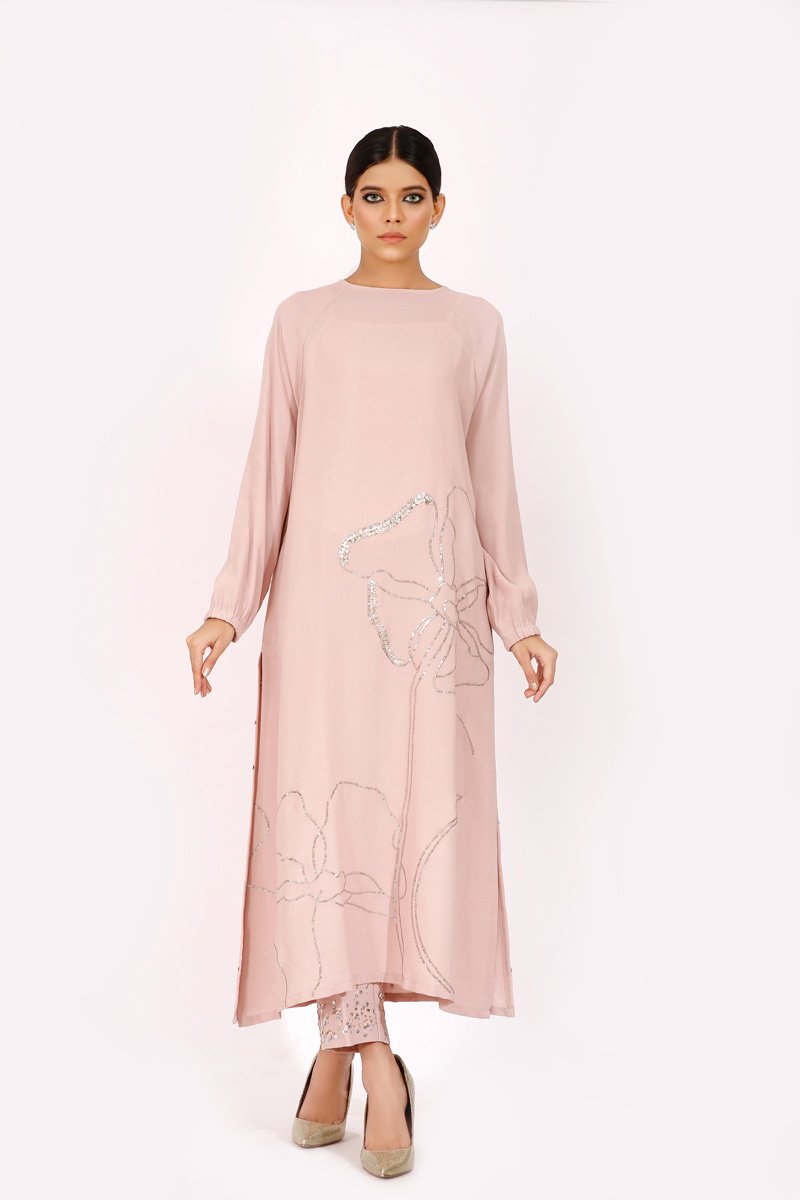 Soft dusky pink long tunic with raglan sleeves. Embroidered with a floral outline with touches of gold and silver sequences with a heavily sprayed sequenced back and shimmery sequenced pants .