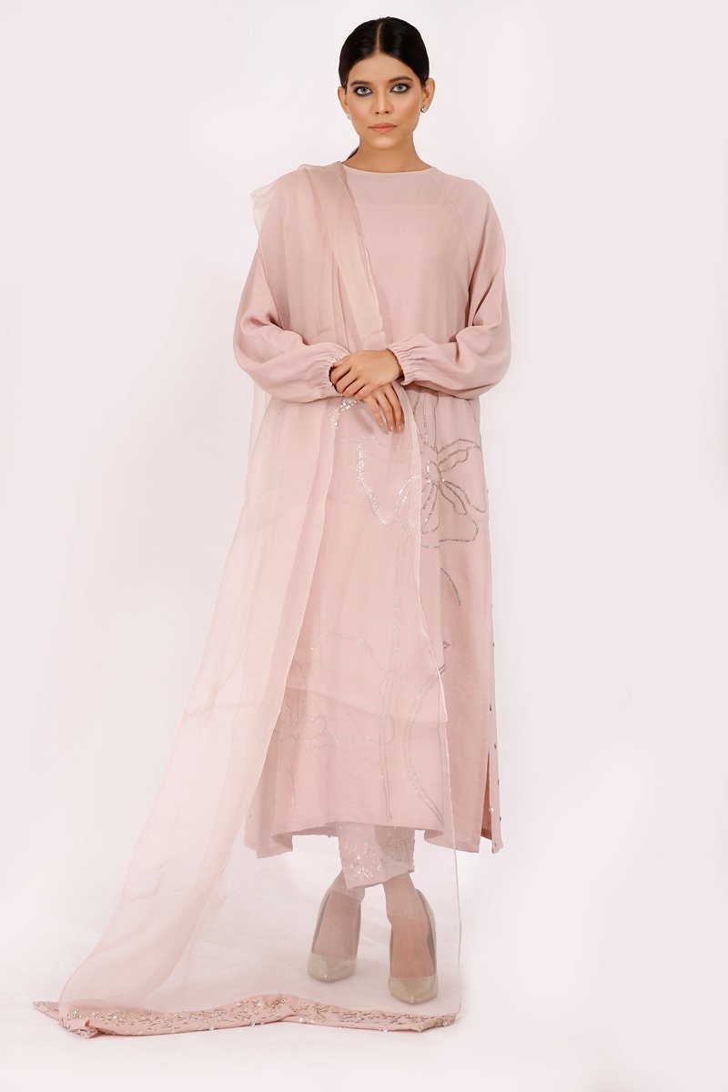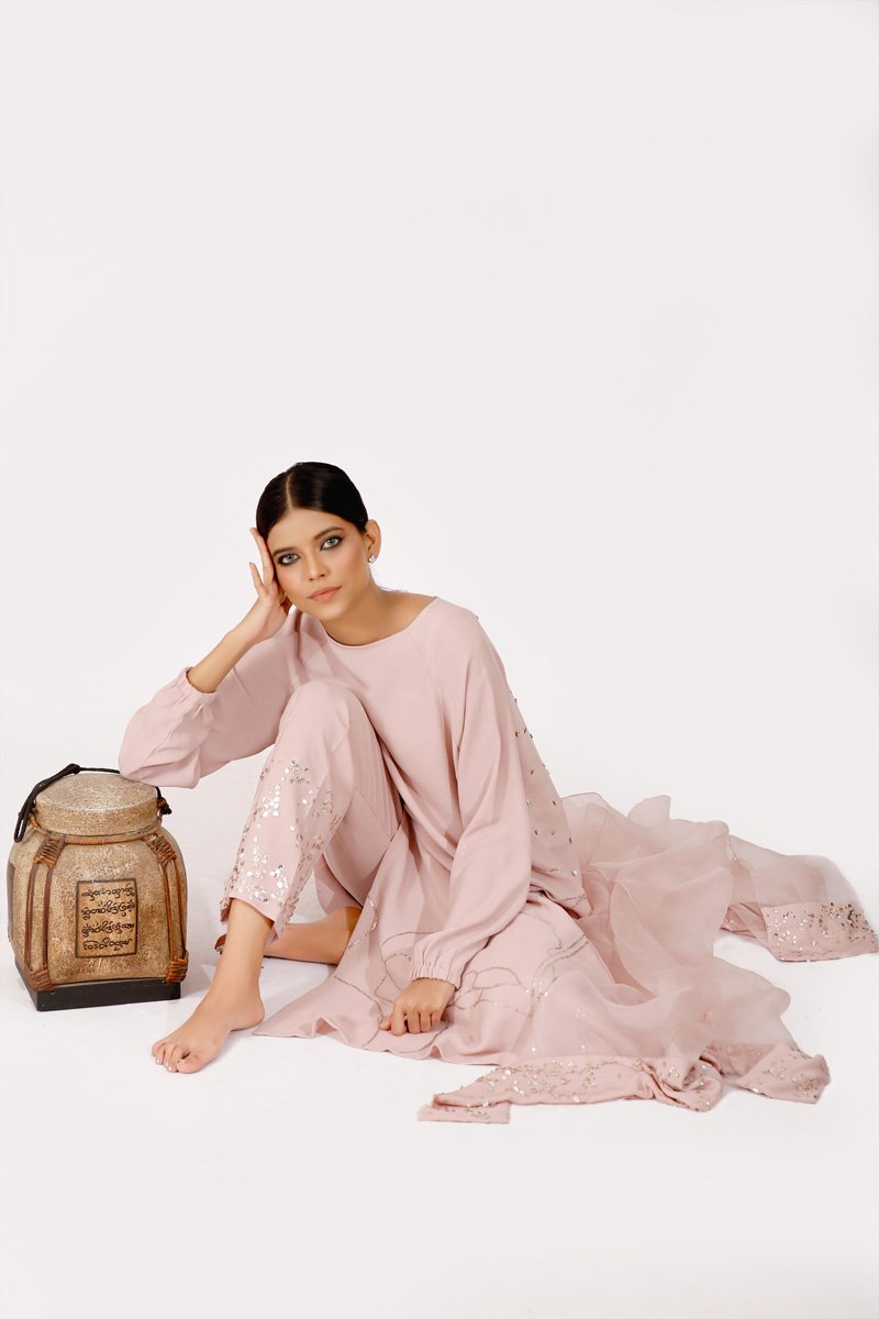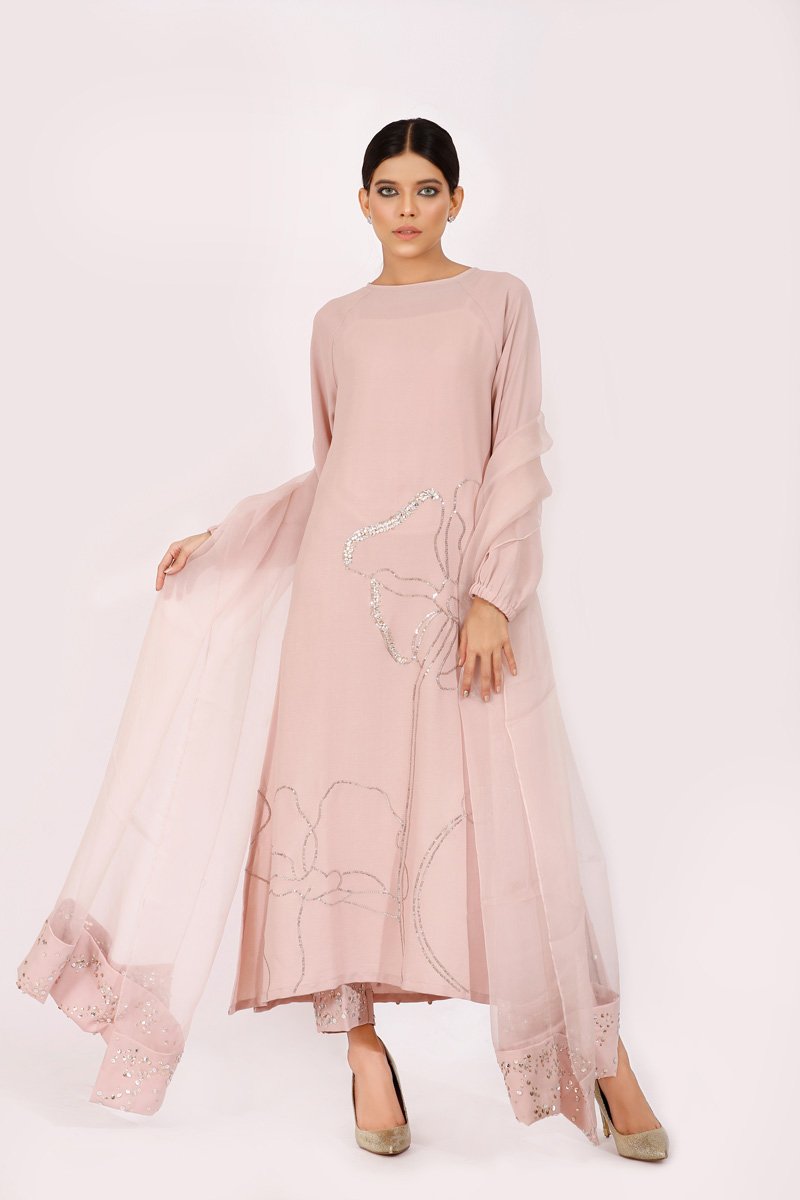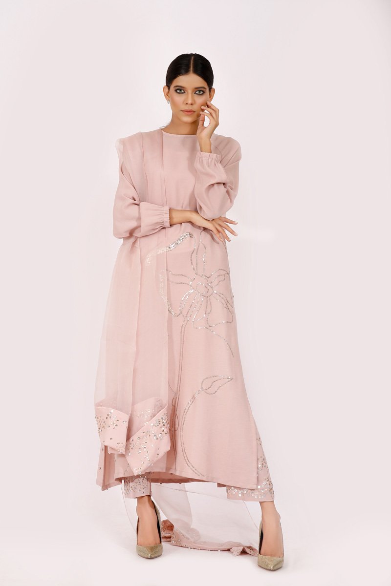 Soft dusky pink long tunic with raglan sleeves. Embroidered with a floral outline with touches of gold and silver sequences with a heavily sprayed sequenced back and shimmery sequenced pants .