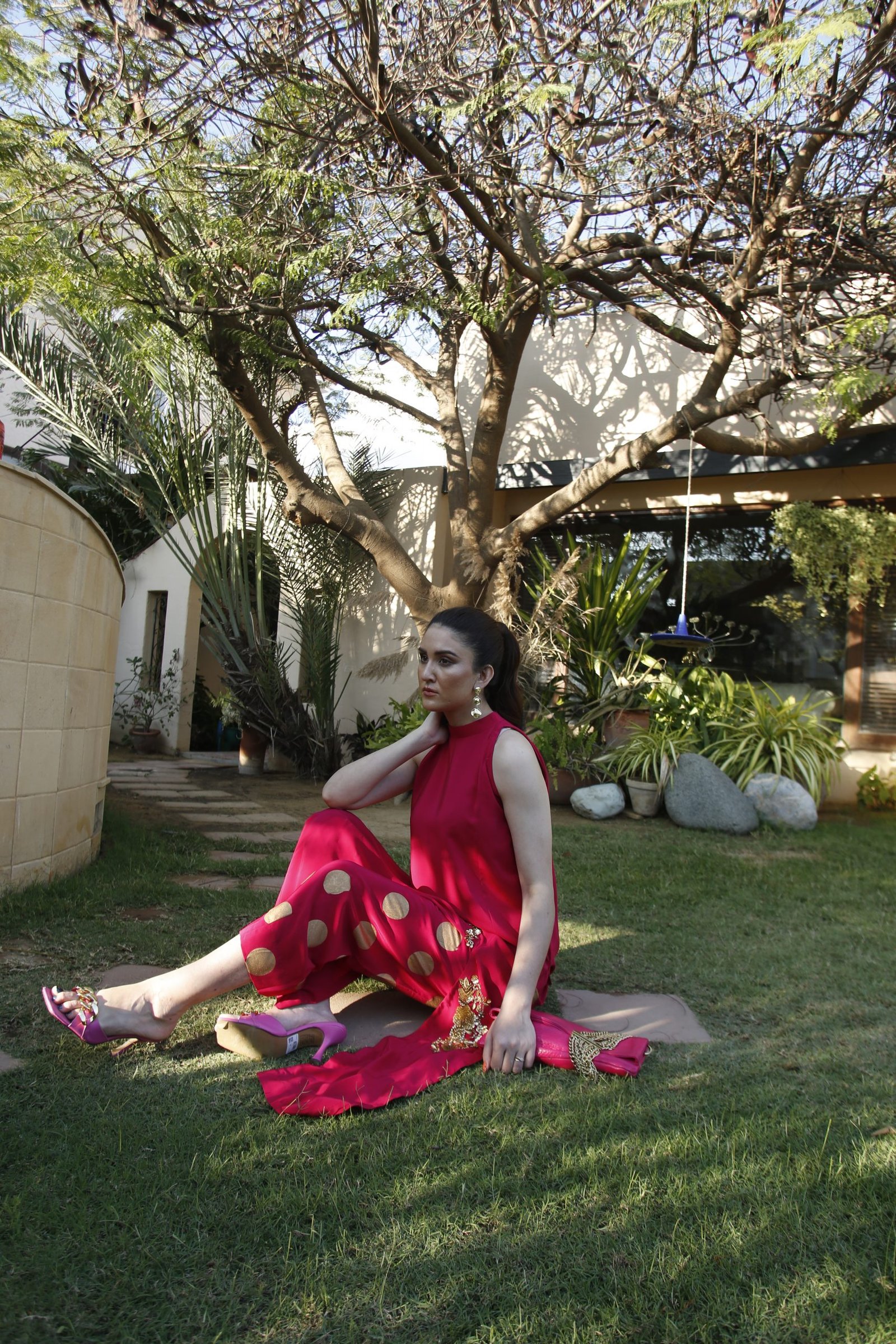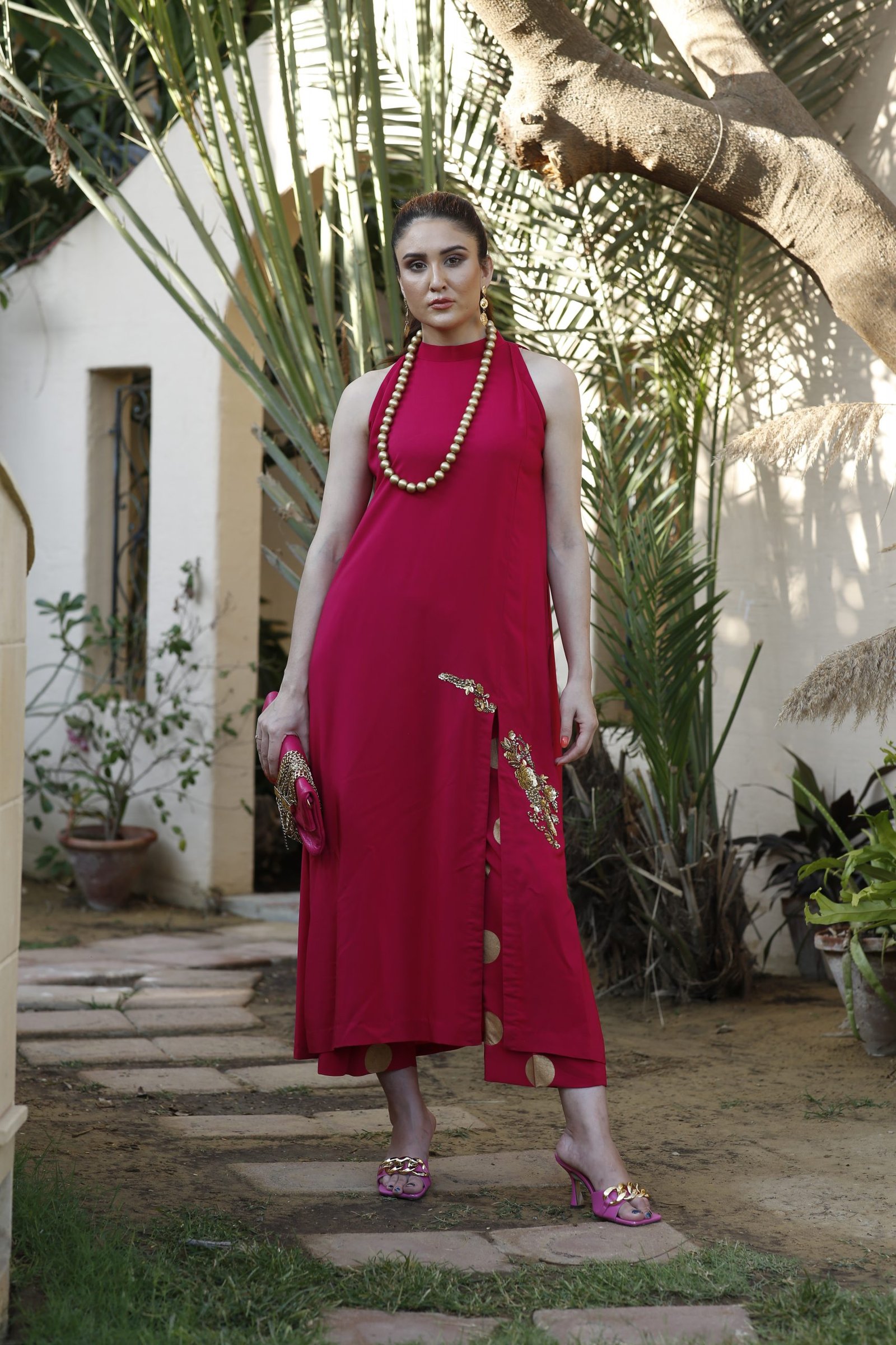 Hot pink front slit long tunic embellished with a gold hand worked motif around the slit worn over fun to wear hot pink high cut pants with gold polka screen.