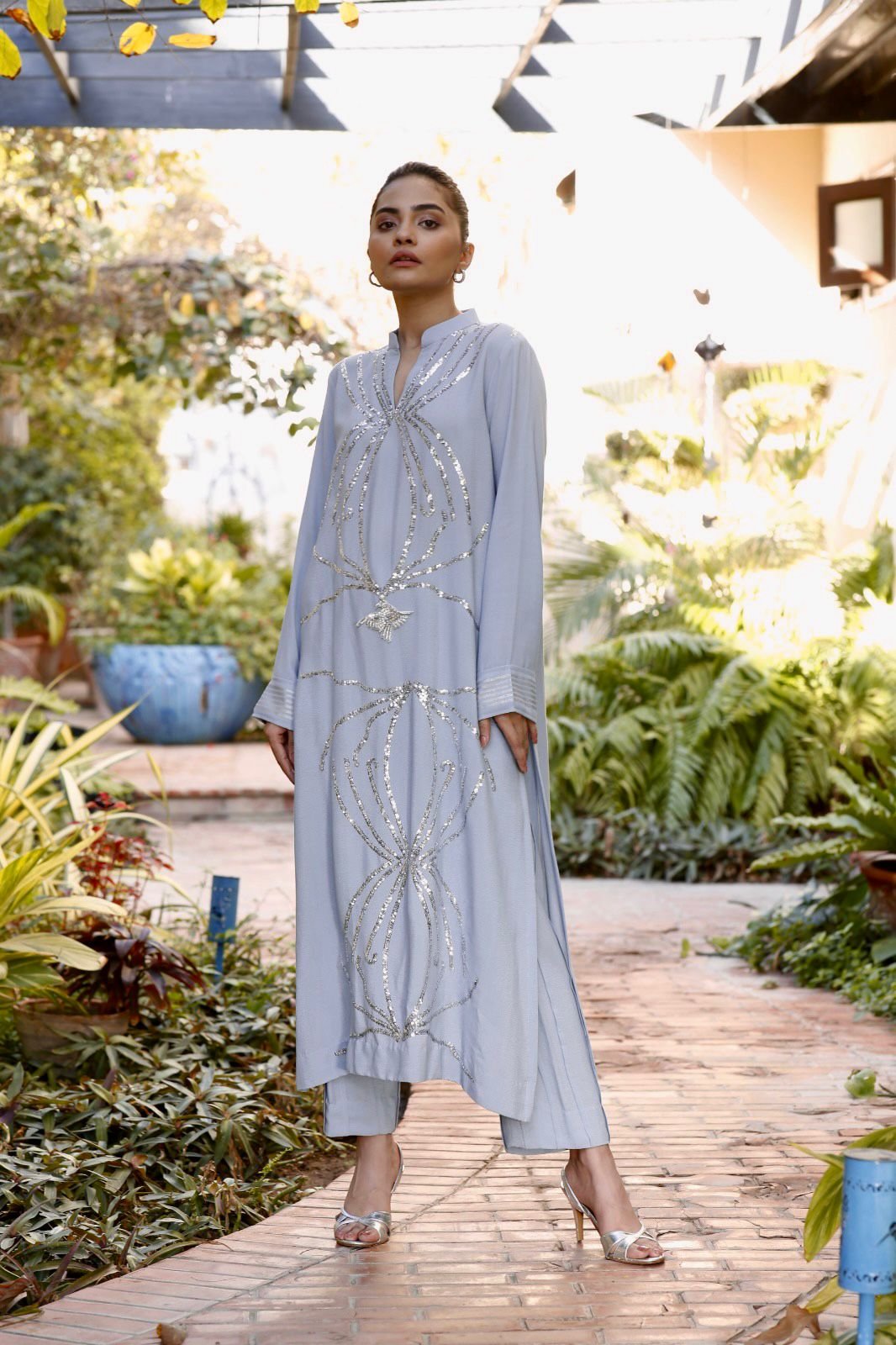 Shimmery ice blue tunic embellished with matt silver sequences and a bird motif worn over pleated high cut pants
