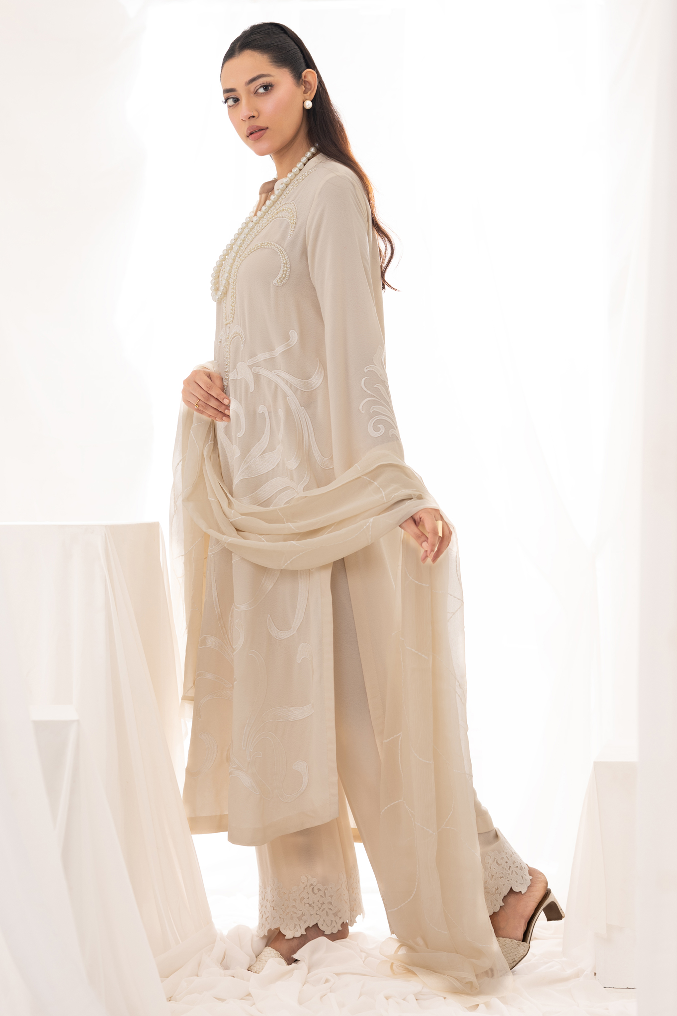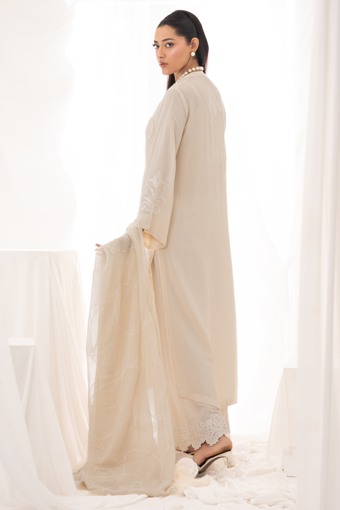 Subtle lily-inspired motifs with geometric accents appear on the sleeves and back, adding continuity and quiet detail throughout the design. The look is paired with ivory trousers finished with delicate lace embellishment at the hem, bringing a refined balance to the silhouette. Completing the ensemble is a light embroidered dupatta, adding softness and movement to the overall look.