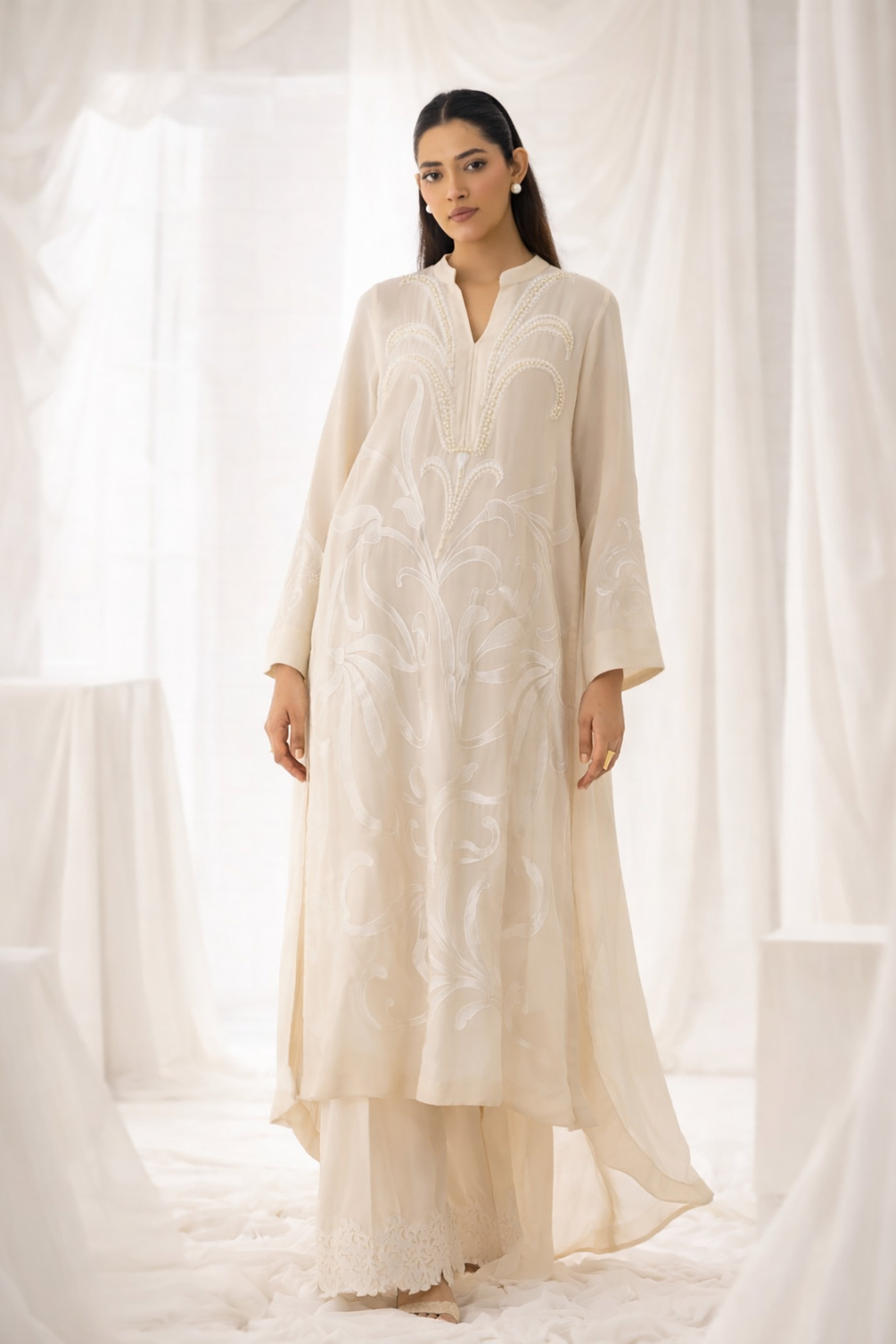 An elegant ivory ensemble inspired by the graceful form of the lily flower. The shirt features exaggerated lily floral embroidery flowing across the entire front, rendered in tonal threadwork that creates depth and soft texture. The neckline is intricately adorned with hand-applied bead and pearl embellishments, forming a sculptural lily motif that draws the eye.