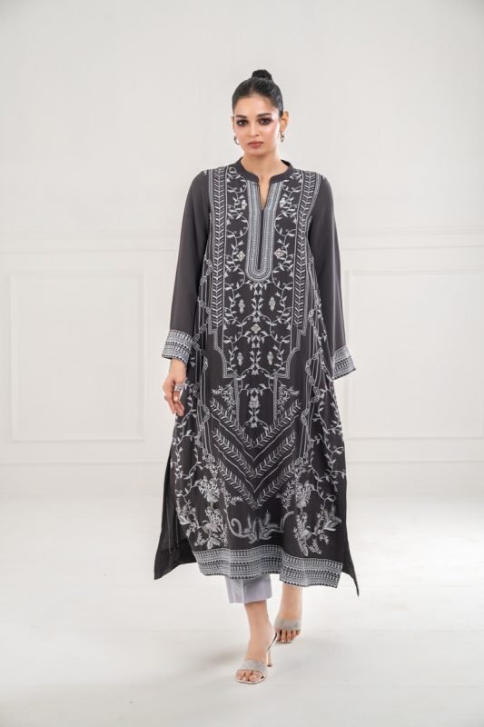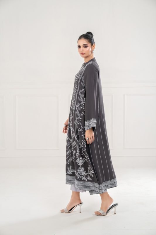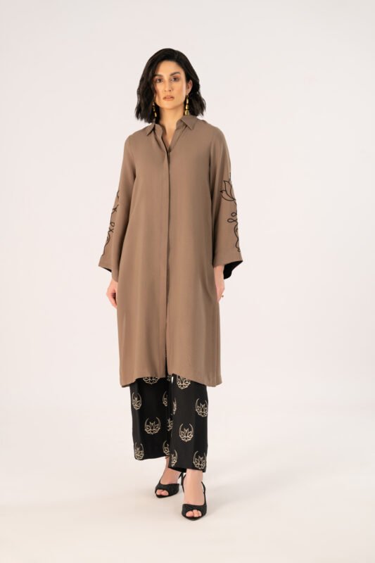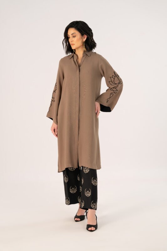 From our Velvet & Floral Series, this rich tea-black mid length velvet shirt features intricately hand-worked pockets— mirroring the elegance of an interwoven weave Paired with beige silk cullote style trousers adorned with off-white floral embroidery inspired by the timeless artistry of Parsi Gara. The ensemble captures a seamless dialogue between tradition and modernity.