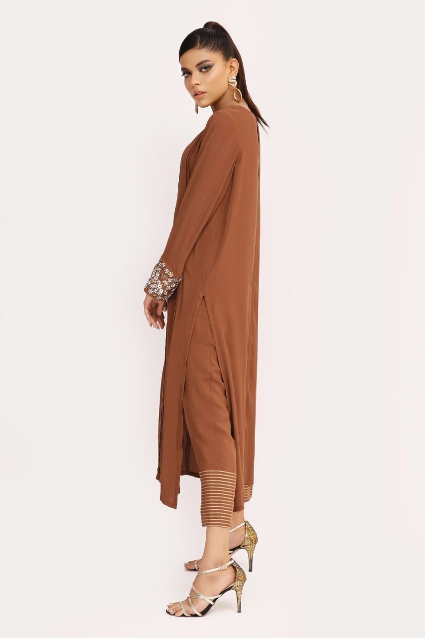 Chocolate brown shirt with pleats and interestingly hand worked cuffs paired with matching gold screen pants.