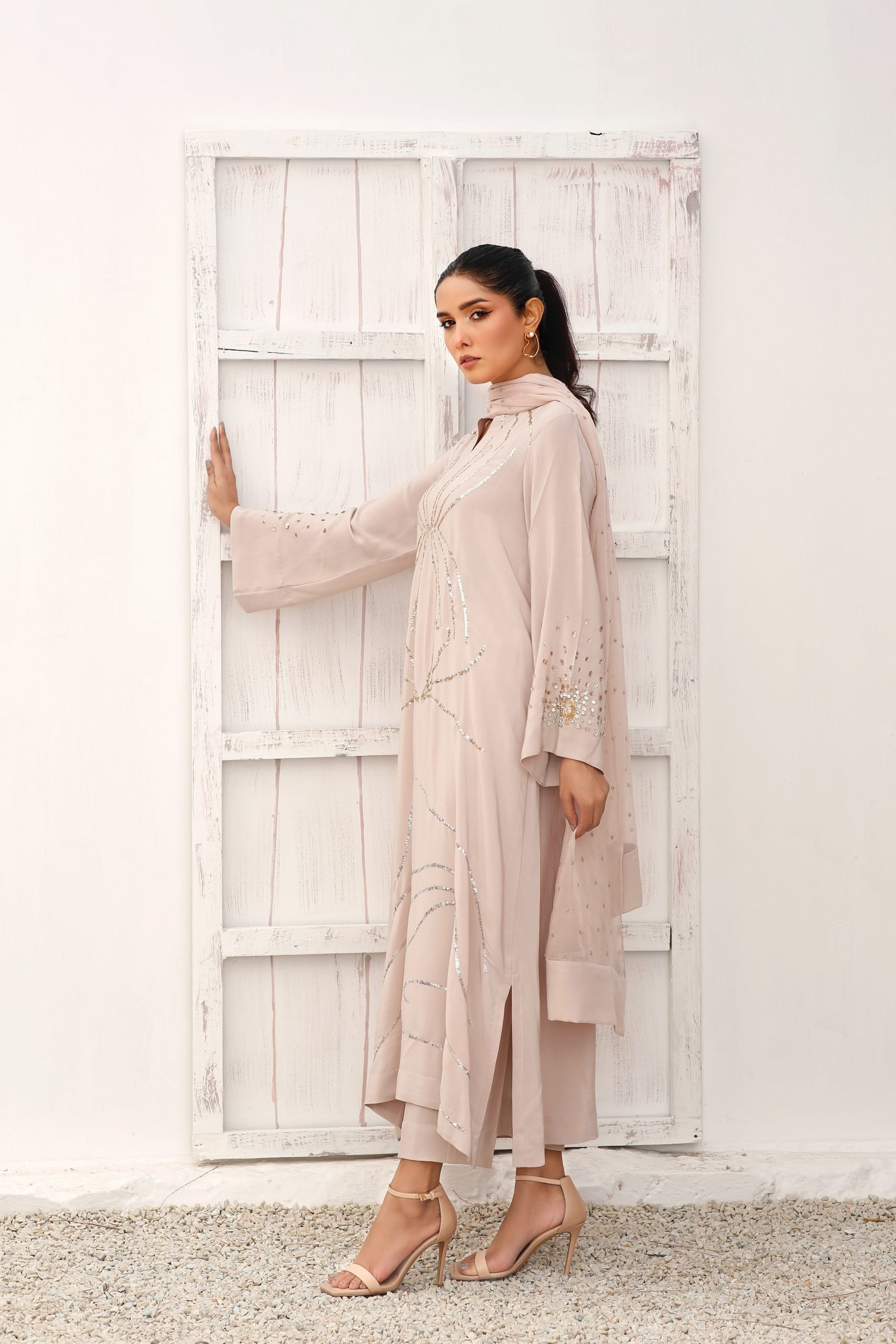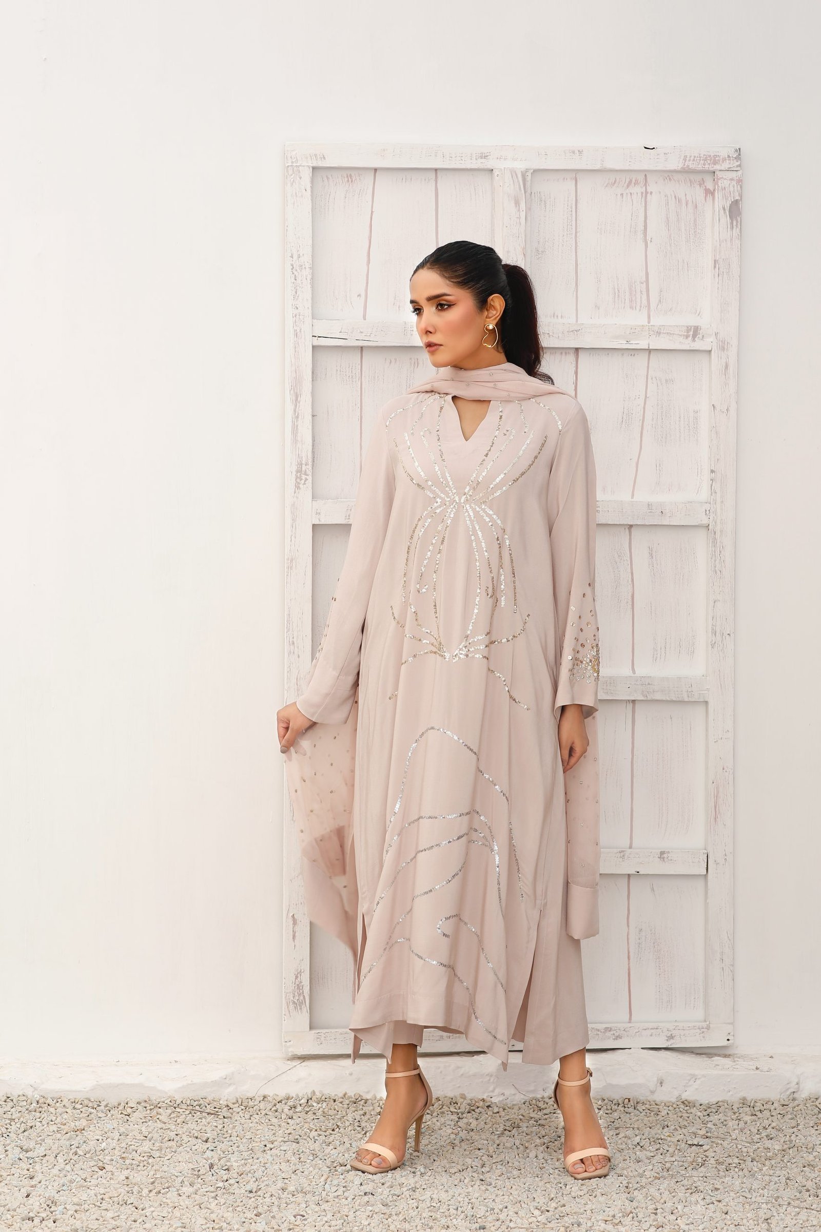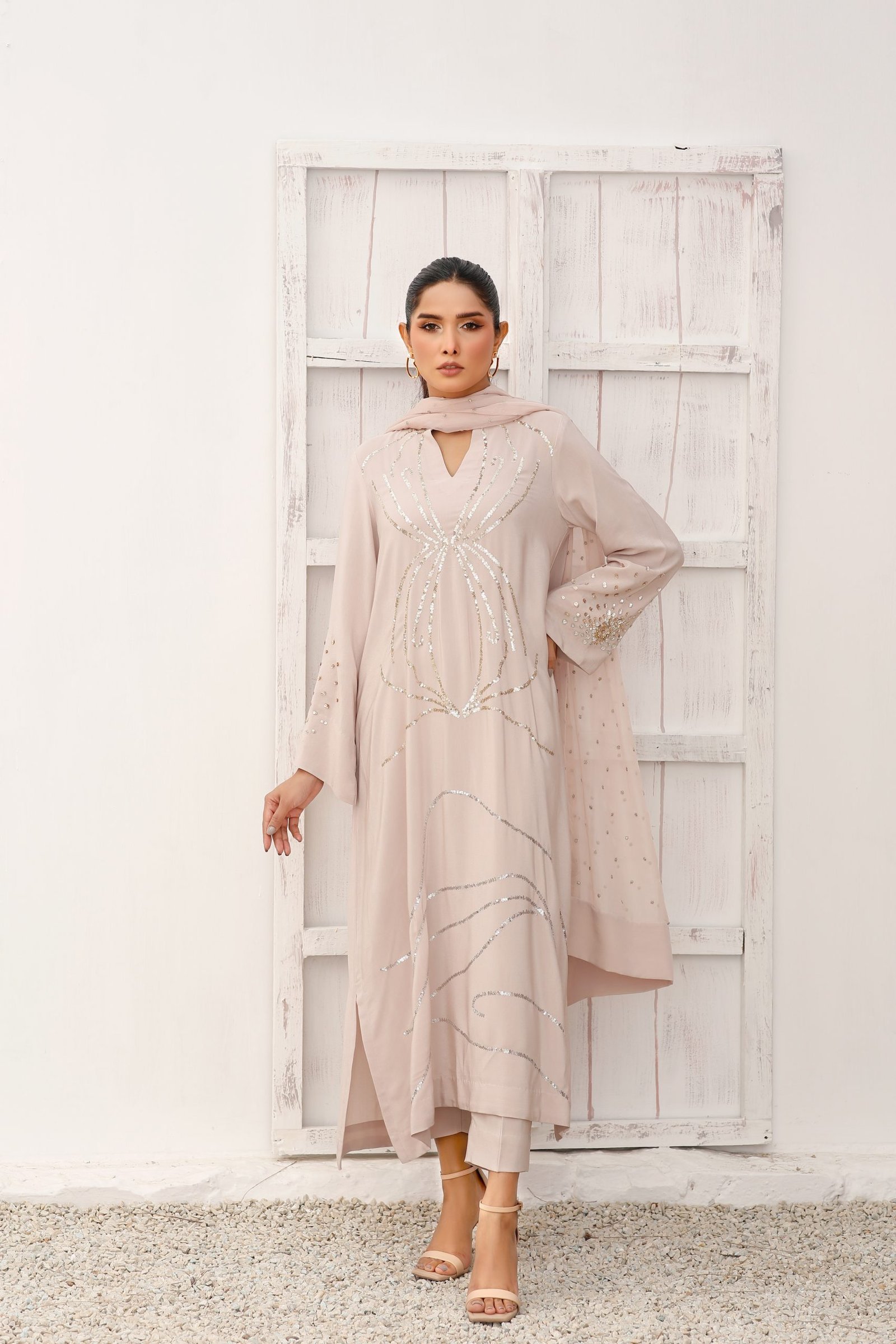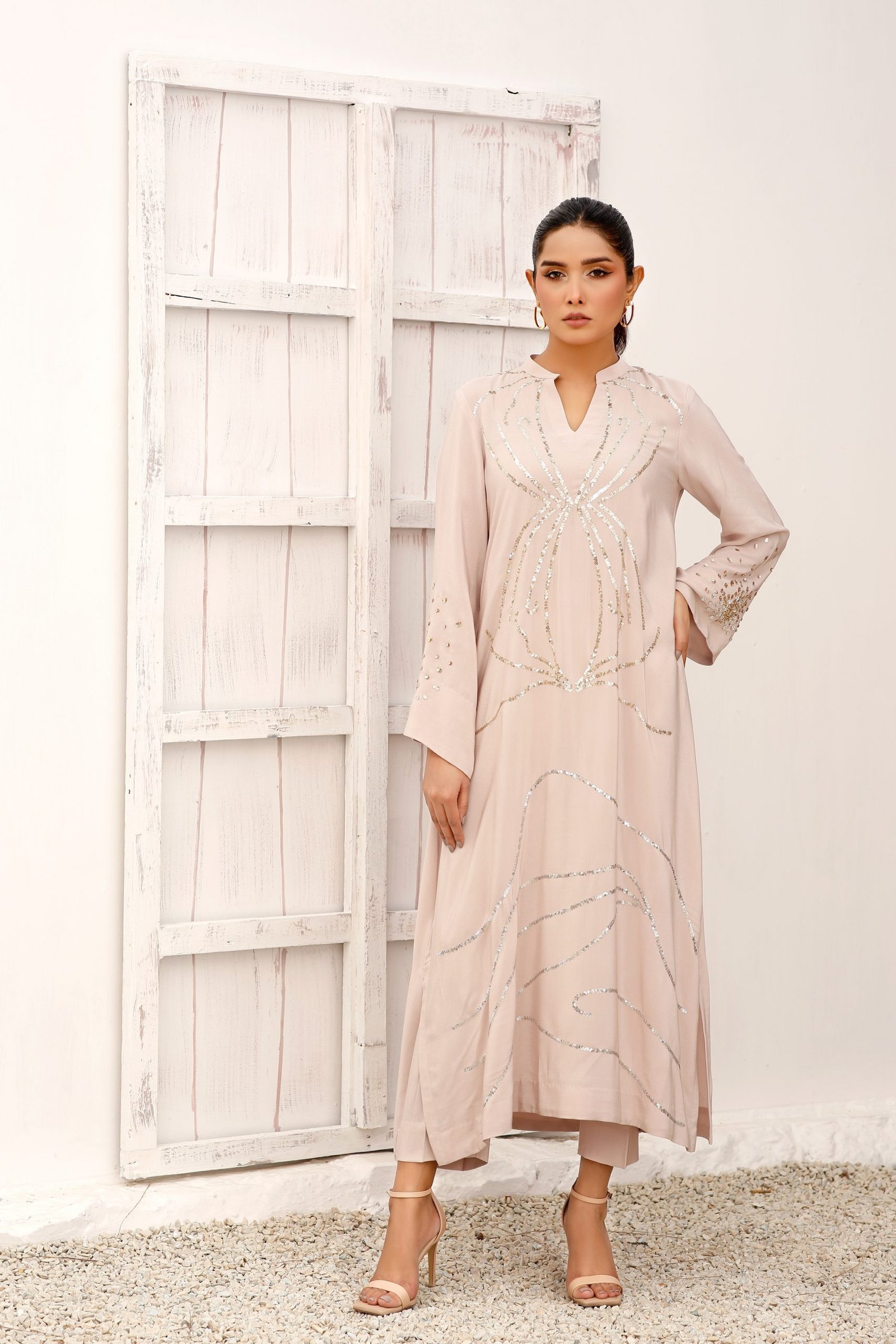 Shimmery skin coloured tunic embellished with dull gold and silver sequences set in a geometrical pattern around the front of the shirt and enhanced with hand work sequenced sleeves.