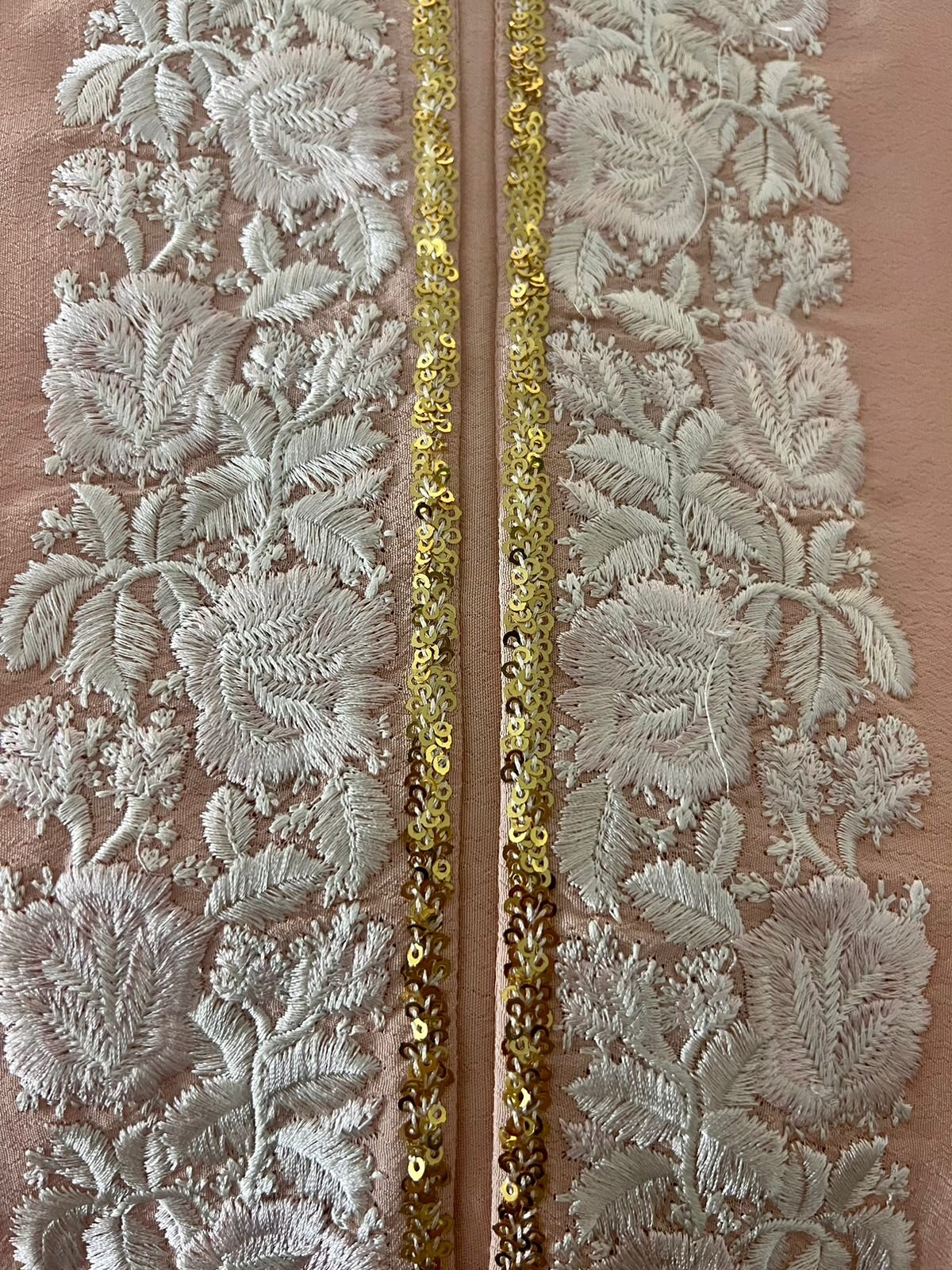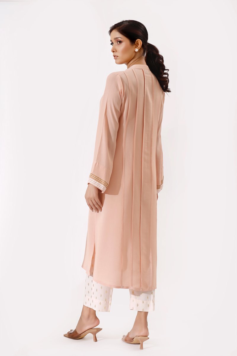 This summery tunic is accentuated with traces of gold sequences around the embroidery of the neck, metallic screen on the cuffs and is paired light peach metallic screened pants .
