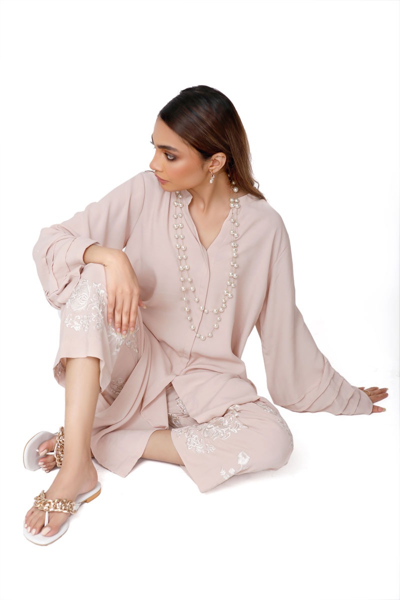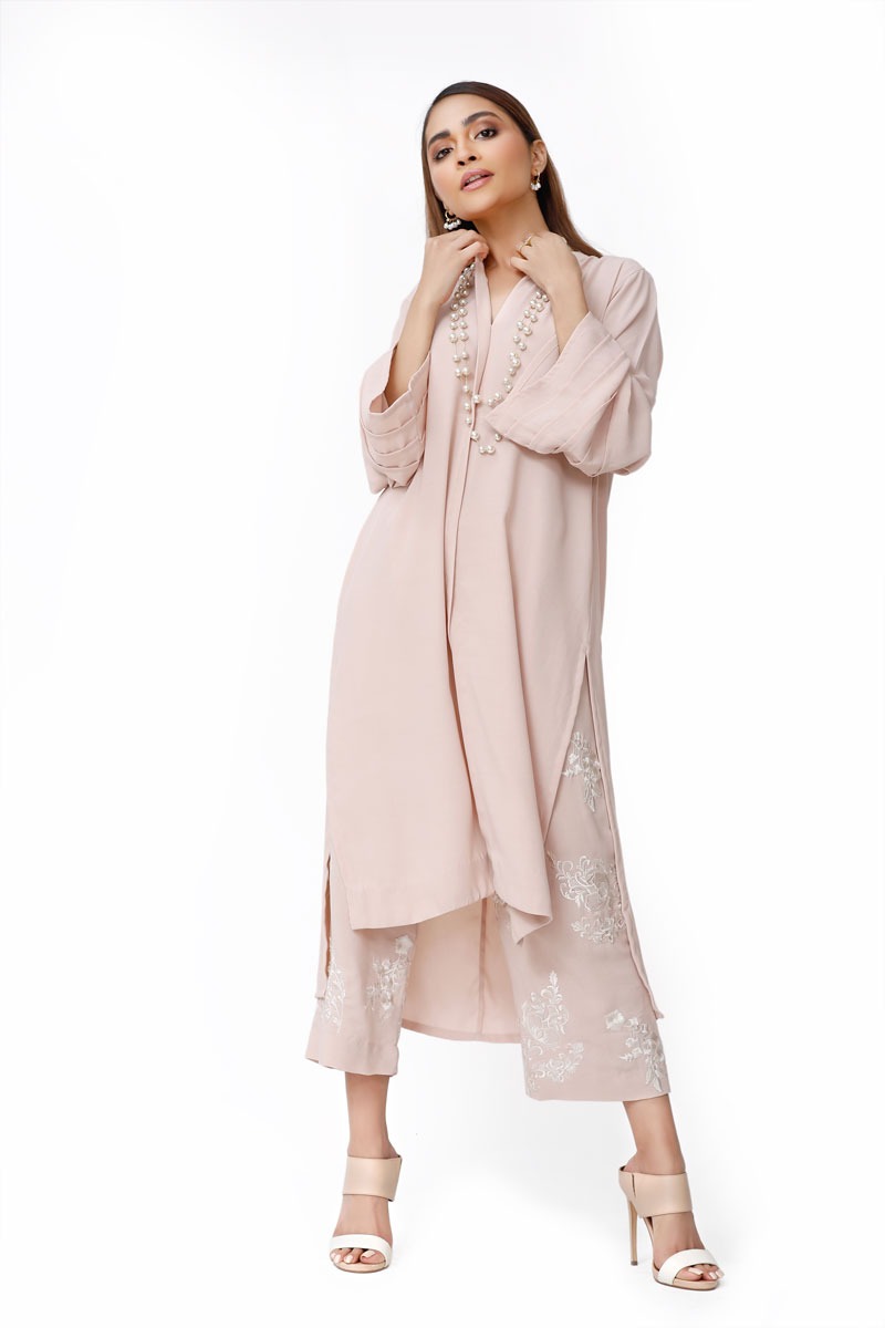 Baby Pink front open style shirt with pleats at the cuffs, paired with heavily embroidered pants.