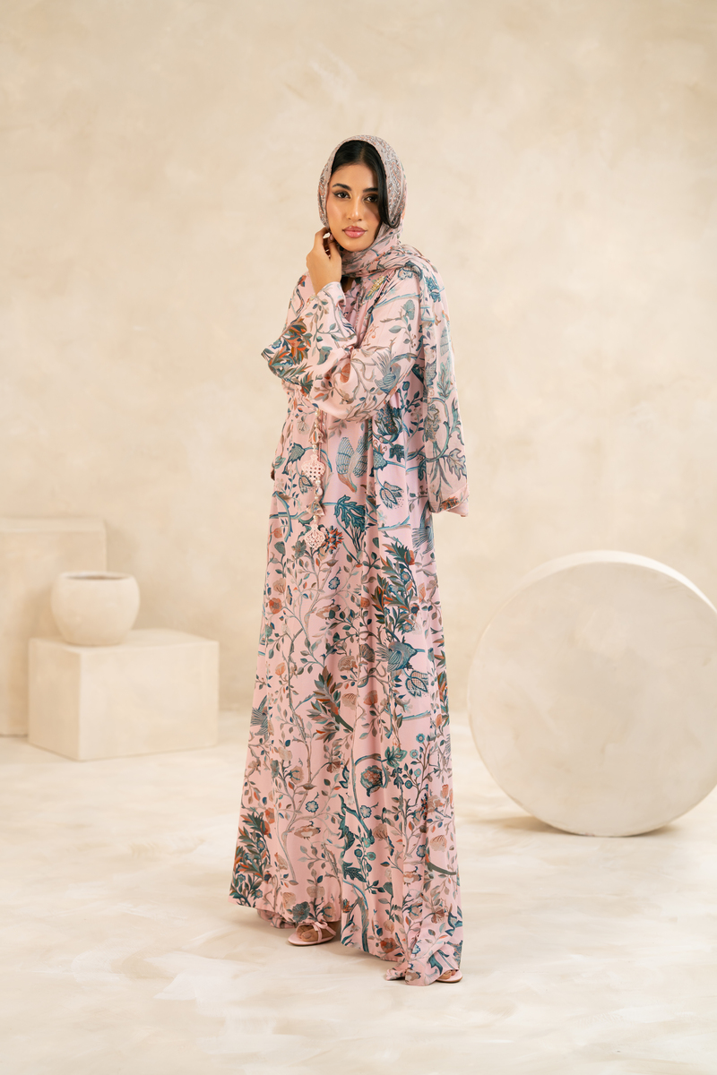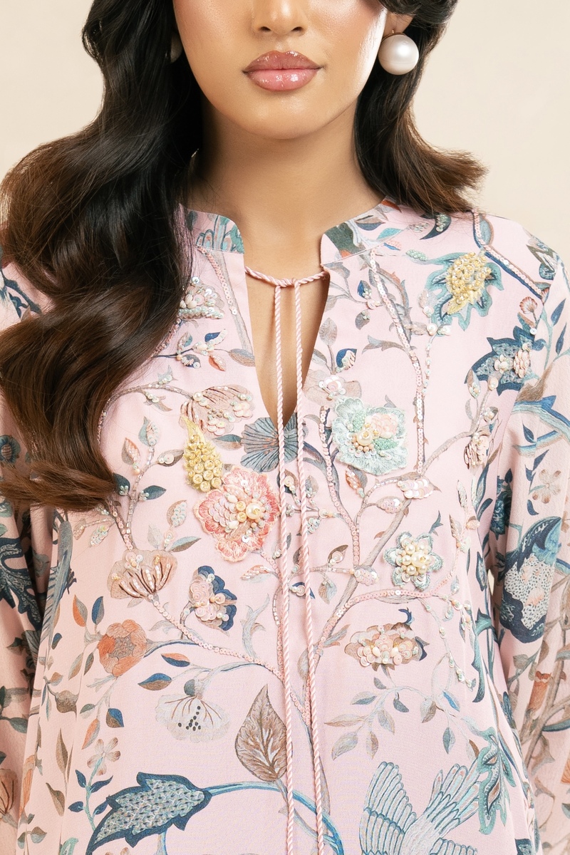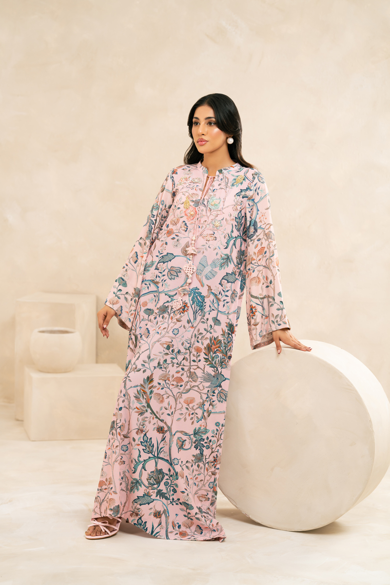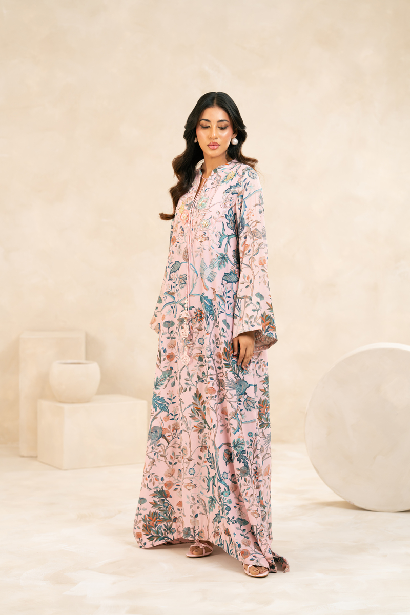 A graceful light pink printed floral kaftaan with a modern twist, inspired by the timeless Tree of Life. Designed in soft, soothing hues, it flows effortlessly to create an aura of elegance and ease. The neckline is exquisitely adorned with delicate pastel hand embroidery, further elevated by mixed embellishments of lace, shimmering beads, and sequins. A matching printed scarf can be added to complete the look, making this ensemble a perfect blend of tradition and contemporary charm.