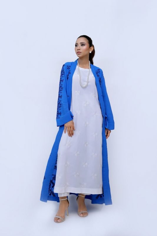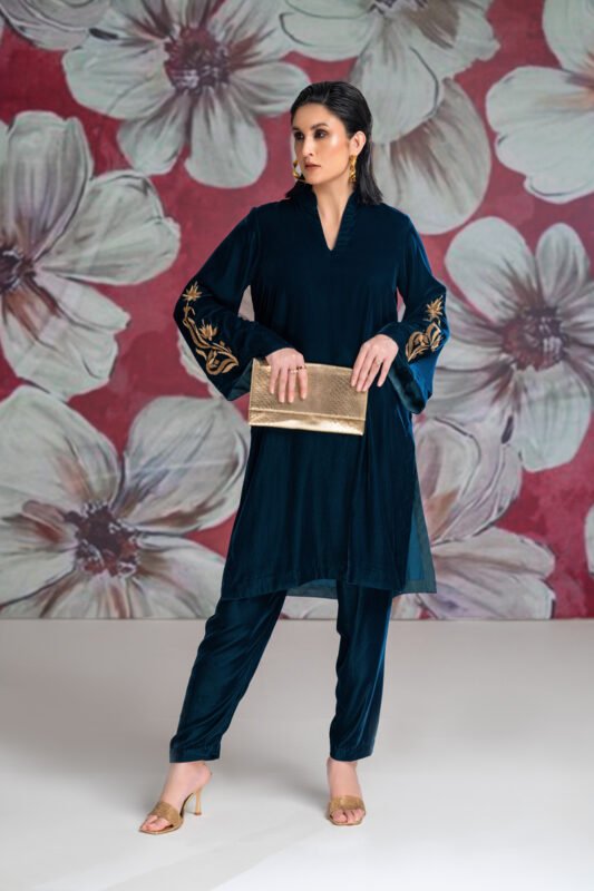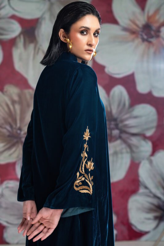 The Deer Story is an ode to the quiet poetry of nature. Set against a deep black base, delicate florals bloom in earthy tones, framing handcrafted deers adorned in resplendent gold. This mid length shirt is worn with plain black straight cut pants and paired with a chiffon stole to complete the look.
