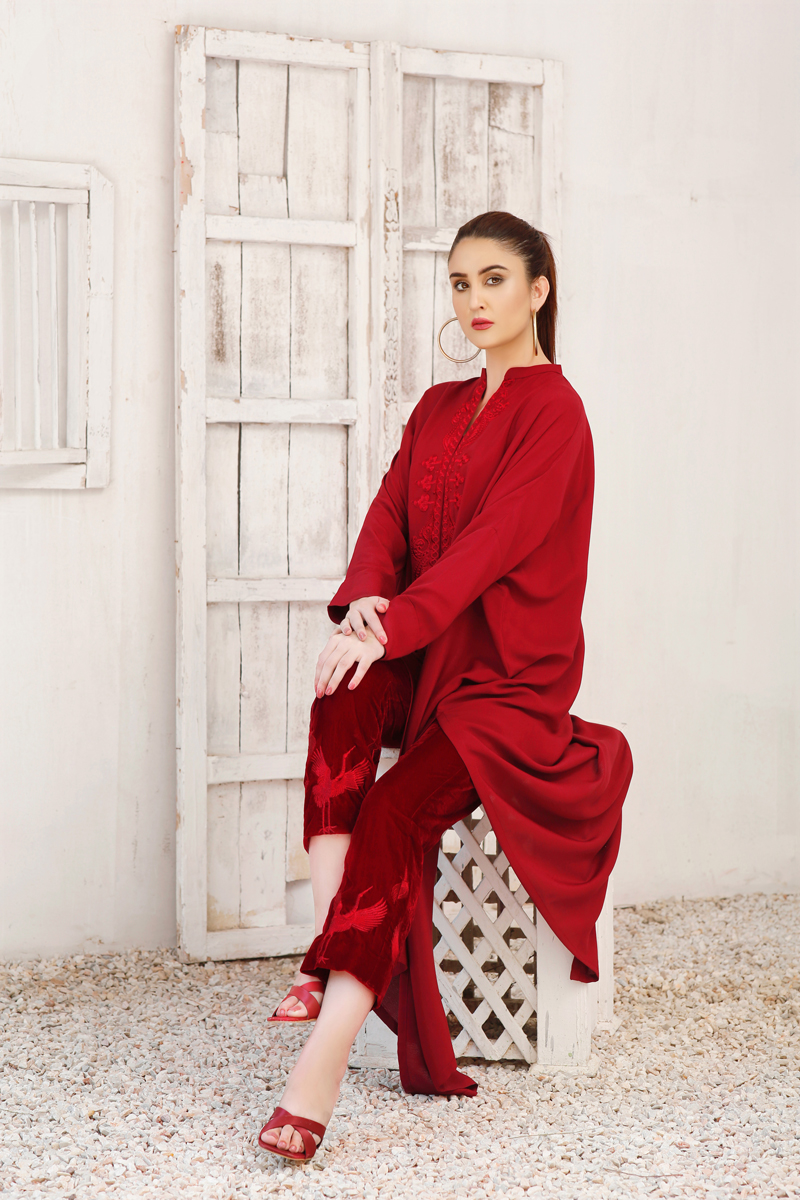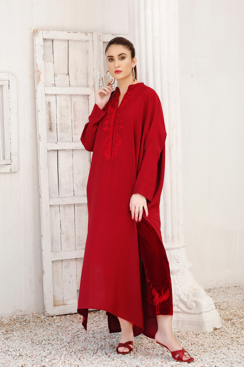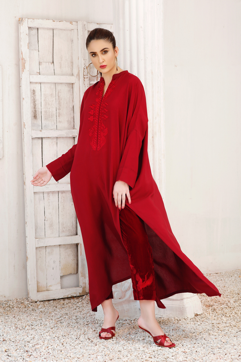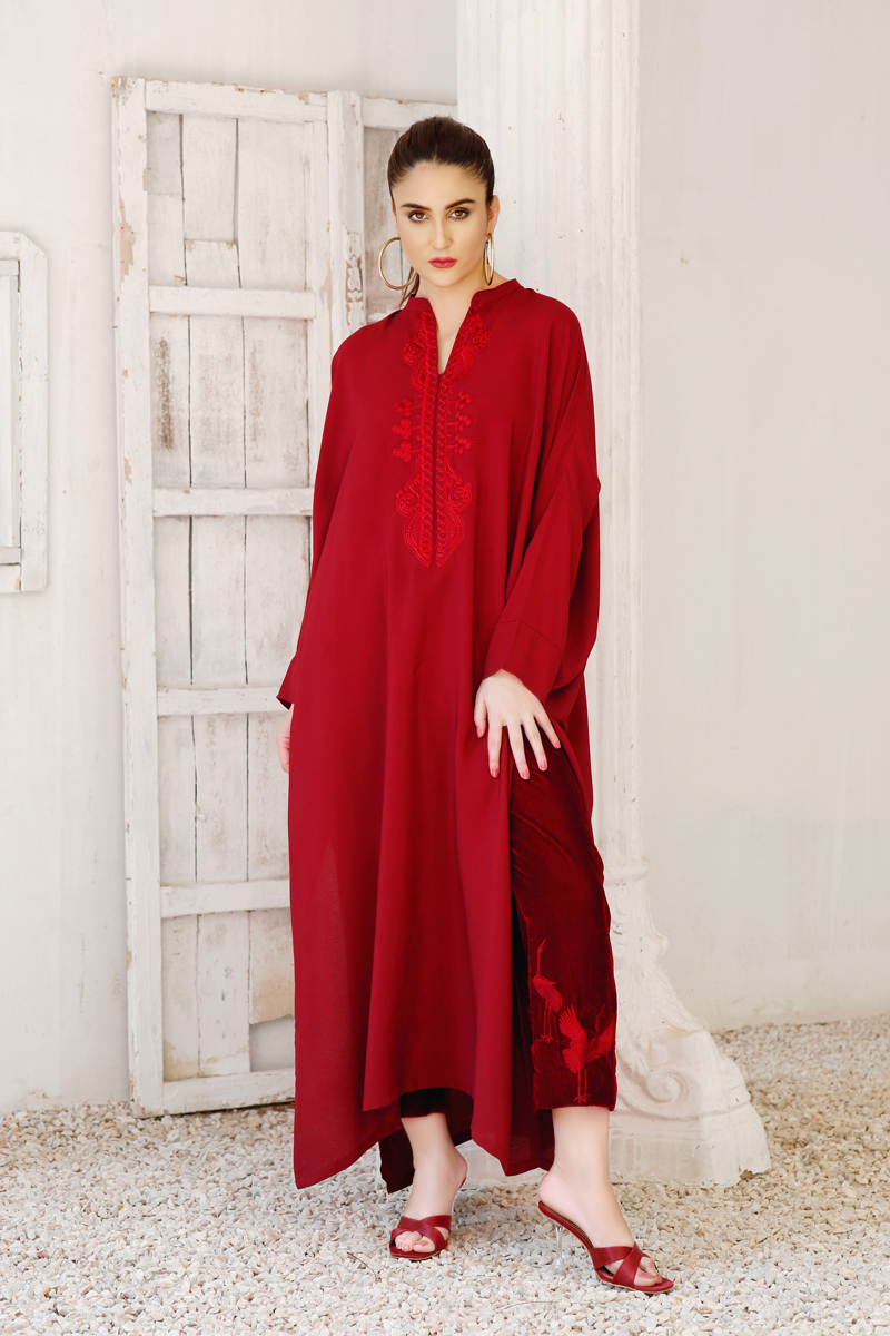 Ruby Red kaftan-inspired free-size shirt with drop shoulders embroidery around the neck, paired with maroon velvet pants embroidered with cranes.