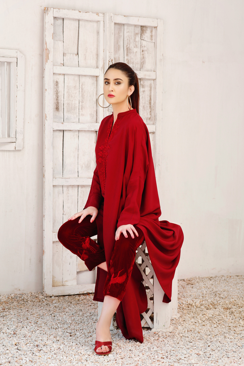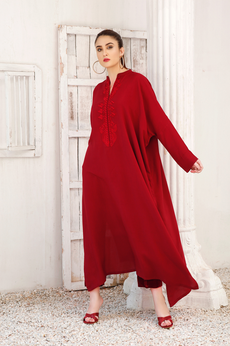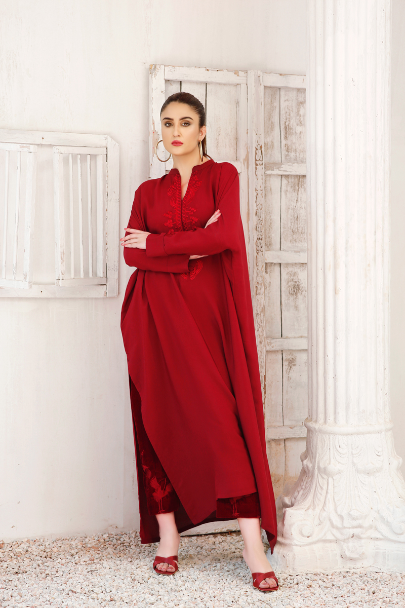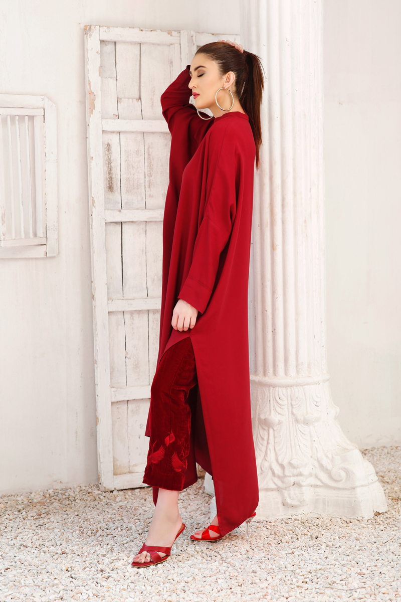 Ruby Red kaftan-inspired free-size shirt with drop shoulders embroidery around the neck, paired with maroon velvet pants embroidered with cranes.